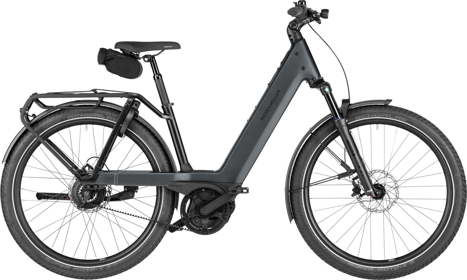 Das Riese&Müller Nevo5 vario Core hat eine aufrechte Sitzhaltung. Der Sattel lässt sich einfach in der Höhe einstellen und ist ergonomisch ausgeformt. Der Vorbau ist ebenfalls einstellbar und der leicht abgewinkelte Lenker hat ergonomische Lenkergriffe für optimalen Komfort.