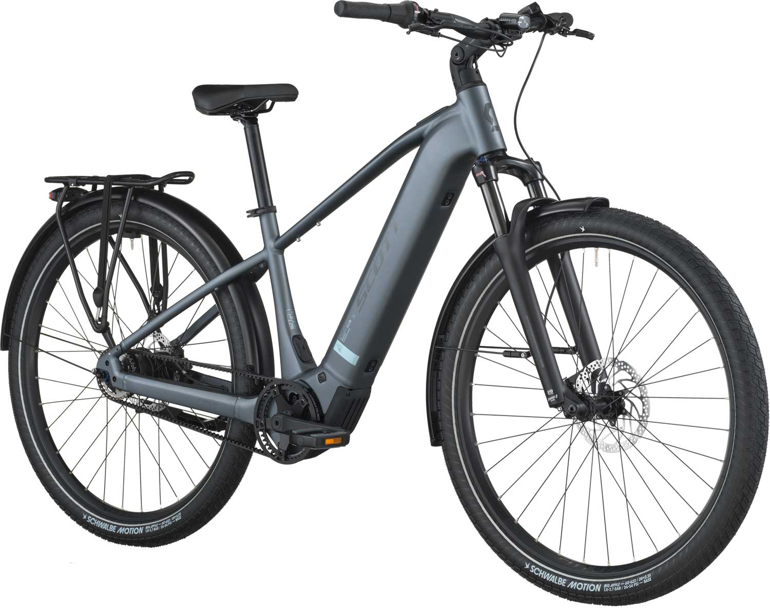 Die bequeme Sitzhaltung machen dieses Scott E-Bike zu einem beliebten Touren E-Bike und der kräftige Motor sorgt für gute Unterstützung.