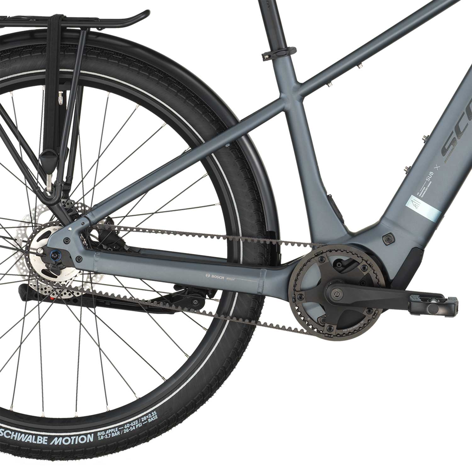 Das Scott Sub Tour 20 Belt ist ein komfortables City E-Bike für Radwege und leichte, unbefestigte Wege. Die aufrechte Sitzhaltung wird durch die ergonomischen Komponenten und den verstellbaren Vorbau sehr gut ergänzt. Geschaltet wird mit der präzisen Shimano 5 Gang Nabenschaltung und die hydraulischen Bremsen plus Rücktrittbremse sorgen auch bei stärkeren Bremsmanövern für optimale Kontrolle. Der leistungsstarke Bosch Performance PX Motor mit 90 Nm zeigt auch an größeren Steigungen keine Schwächen. Der integrierte 600 Wh große Li-Ionen Akku bietet auch für größere Touren genügend Reserven.