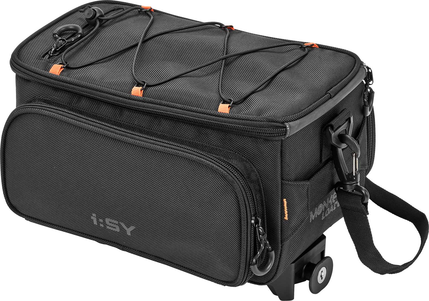 Die i:SY Gepäckträgertasche Trunk Bag 2.0 ist eine Packtasche, die auf den MonkeyLoad Gepäckträger aufgesetzt wird und dort sicher einrastet. Die Fahrradtasche hat links und rechts je eine große Seitentasche, welche einfach bei Bedarf heraus geklappt werden kann. Hier haben zum Beispiel Jacken oder Getränke bequem Platz. Das große Hauptfach ist gepolstert und ist ca. 30 x 22 x 20 cm (L x B x H) groß. In diesem Hauptfach ist eine weitere kleine Tasche z.B. für Kleingeld, sowie ein abnehmbarer Schlüsselanhänger eingenäht. Auf dem Deckel der Tasche befindet sich ein Gummizug und eine kleine Reißverschlusstasche.