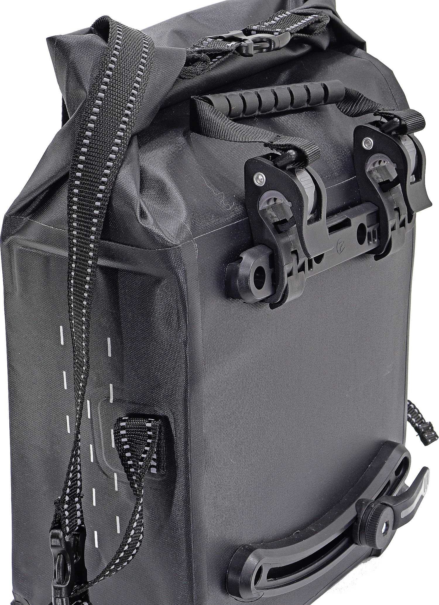 Die Tasche wird einfach mit der selbstsichernden Fixierschiene oben an einer Seitenstrebe des Gepäckträgers befestigt und kann durch einfaches Anheben wieder gelöst werden. Die Vertex-Haken sind selbstsichernd und verhindern ein Abfallen der Tasche bei schlechten Untergrund oder holprigen Strecken. Die Position der Haken kann auf der Schiene leicht verstellt werden und ist somit für alle Gepäckträger leicht anpassbar.