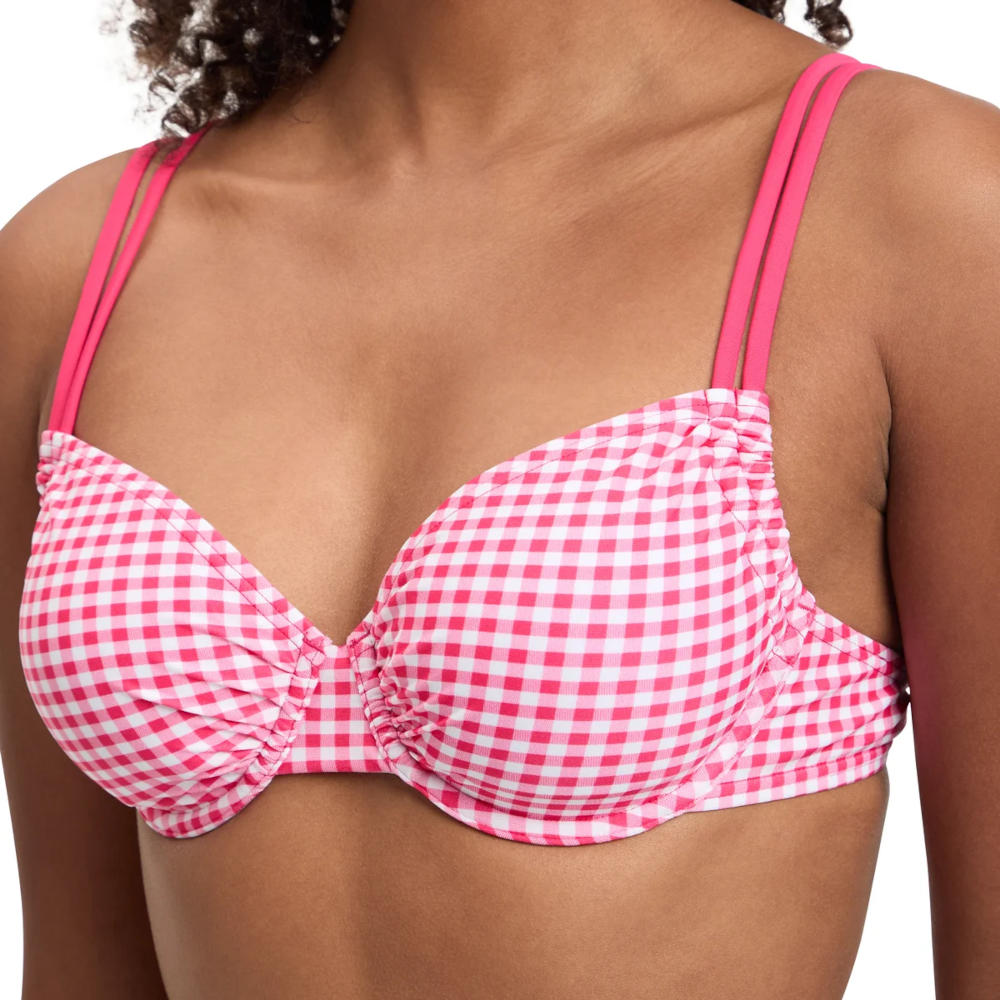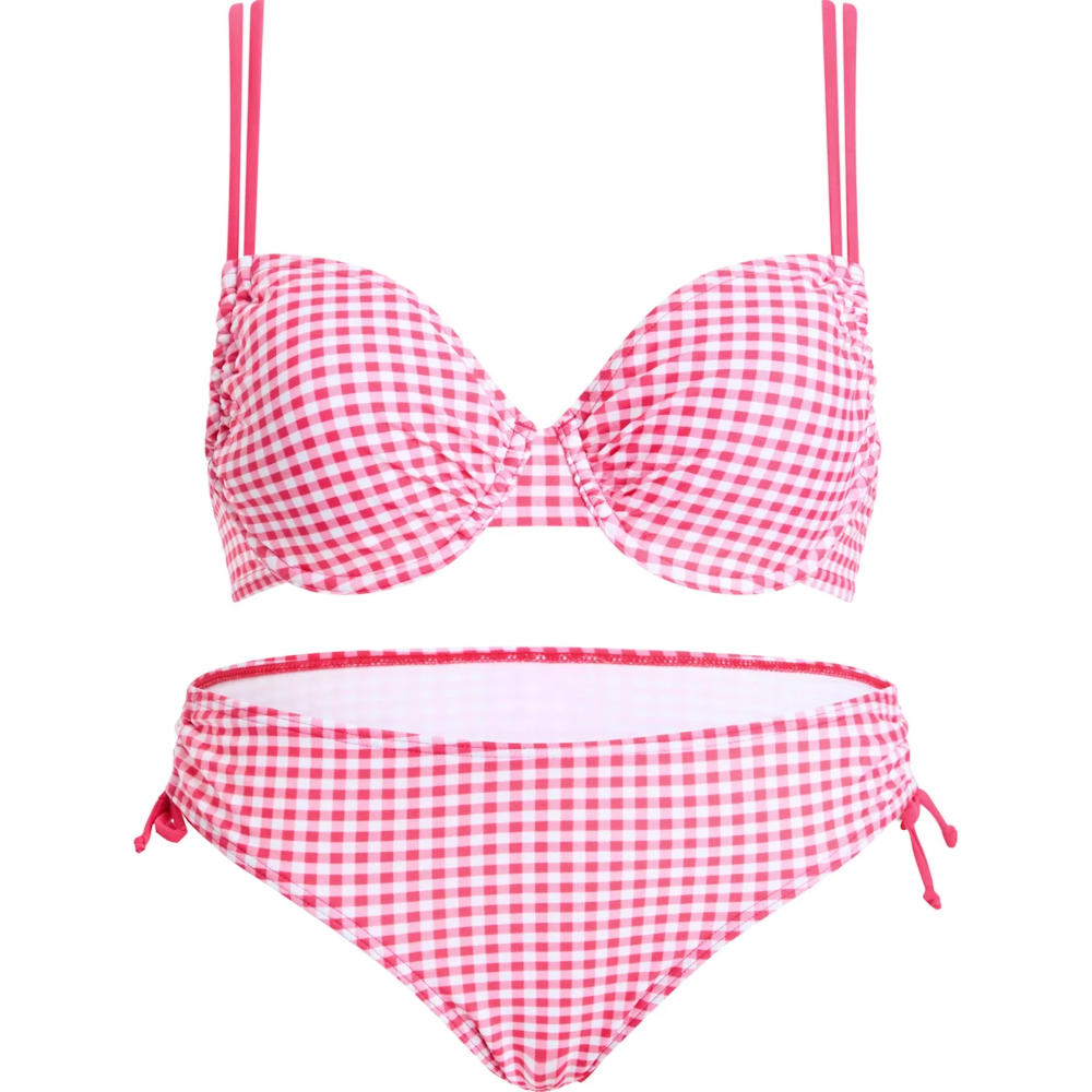 Eleganter Bügel-Bikini im Vichy-Look. Dieser stilvolle Bügel-Bikini besteht aus 82% Polyamid und 18% Elasthan für eine perfekte Passform und hohen Tragekomfort. Das Vichy-Allover-Print verleiht dem Design einen klassischen, trendigen Touch. Der Clipverschluss am Rücken sorgt für einfaches An- und Ausziehen, während die längenverstellbaren Träger und herausnehmbare Paddings individuellen Halt und Flexibilität bieten. Die Bikinihose ist als Brief mit seitlicher Raff-Schnürung gestaltet – für eine feminine und variable Passform.
