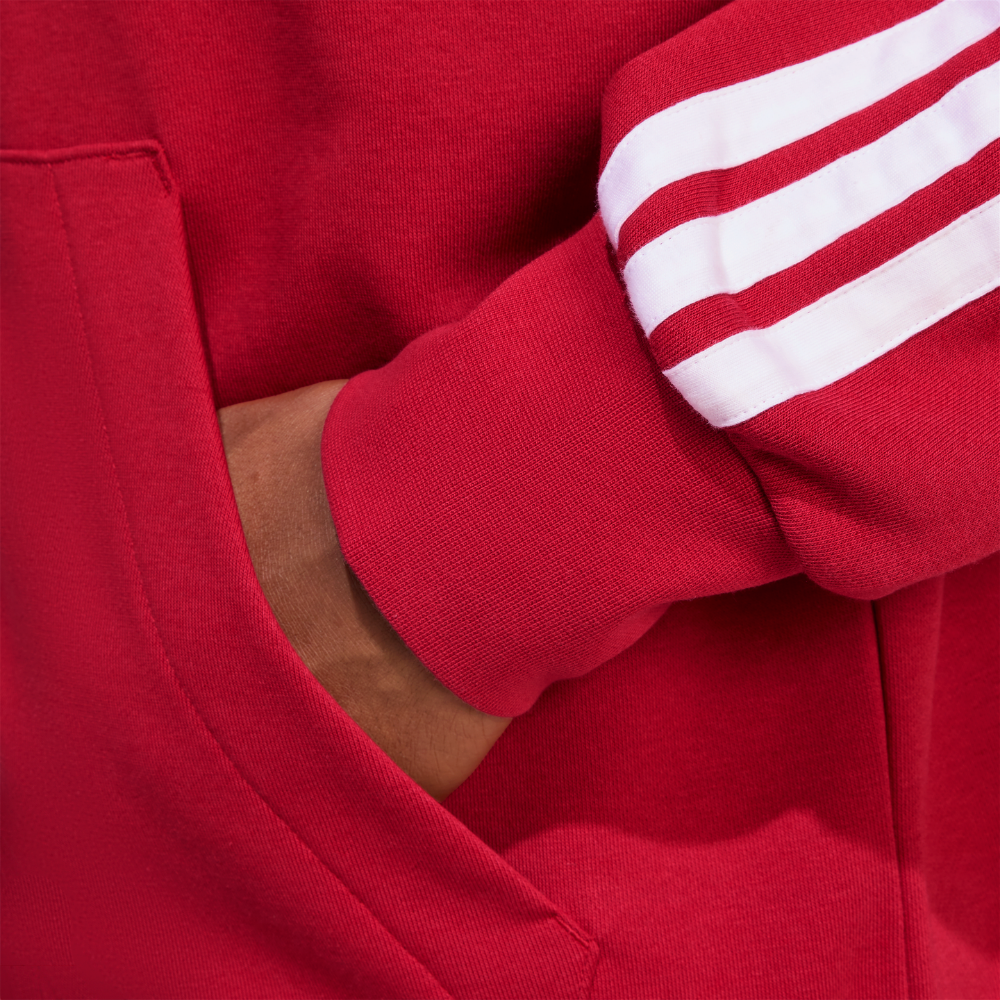 Die Ausstattung lässt keine Wünsche offen. Ein durchgehender Reißverschluss schließt am Kragen mit einem bequemen Rundhalsausschnitt ab und geht nahtlos in eine weitenregulierbare Kapuze mit Kordelzug über. In den großzügigen Kängurutaschen kannst du deine Hände wärmen oder wichtige Kleinigkeiten verstauen. Die legendären 3-Streifen an den langen Ärmeln feiern die sportlichen Wurzeln der Marke. Diese Kapuzenjacke sorgt stets für ein angenehmes Tragegefühl, egal, ob du deinem Lieblingsteam auf der Tribüne zusiehst oder dich einfach nur zu Hause entspannen willst. Bestelle diese stylishe Herren Sweatjacke jetzt sofort im Shop und sichere dir dein neues Wohlfühl-Piece!
