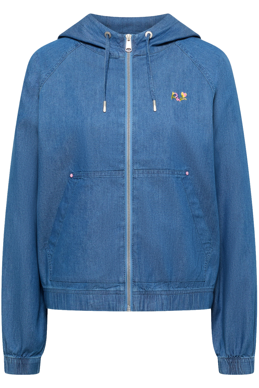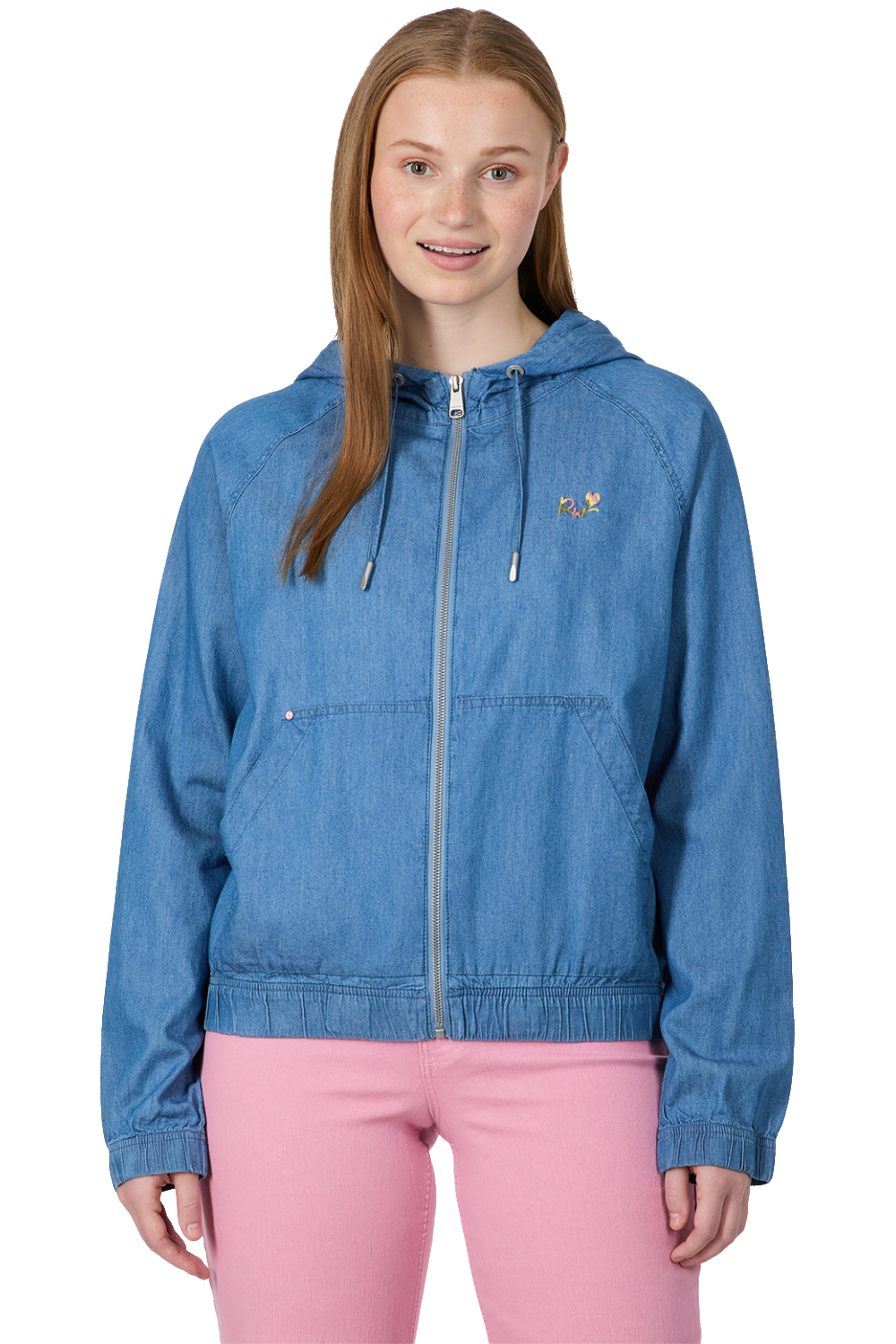 Eine verstellbare Kapuze mit Kordelzug, ein elastischer Saum sowie elastische Ärmelabschlüsse sorgen durchgehend für einen bequemen Sitz bei jeder Bewegung. Optisch setzt eine kleine Stickerei auf der Brust einen dezenten, verspielten Akzent. Dieses durchdachte Design macht die unkomplizierte Jacke zum perfekten Begleiter für Frühling und Sommer. Das Modell lässt sich easy zu Jeans, Shorts oder Kleidern kombinieren. Erweitere deine Garderobe um diese vegane Denimjacke und bereite dich stilvoll auf die wärmeren Tage vor.