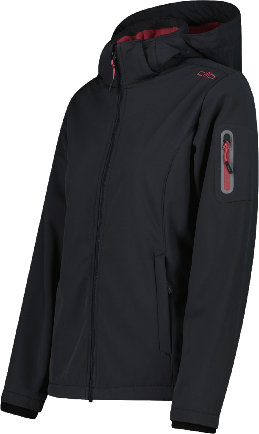 CMP "WOMAN JACKET ZIP HOOD" Damen Softshelljacke verbindet den klassischen CMP Outdoor Stil mit praxisnaher Funktion. Die Softshell Außenlage ist mit einer weichen Fleece Innenseite verblockt. Dazwischen arbeitet die Clima Protect® Membran mit 7 000 mm Wassersäule und 1 000 g/m²/24 h Atmungsaktivität. So perlt Nässe außen ab, während Feuchtigkeit nach außen entweichen kann und dein Mikroklima ruhig bleibt. Die Damen Softshelljacke ist damit die verlässliche Wahl für Übergangstage, Stadtwege und kurze Touren. Die Kapuze lässt sich fein per Kordelzug einstellen oder komplett abnehmen, wenn du freies Sichtfeld bevorzugst. Der durchgehende Frontreißverschluss schließt sauber, die Scheuerschutzleiste schützt den Hals. Elastische Ärmelbündchen halten die Wärme im System. Am unteren Saum sorgt der doppelte Tunnelzug für präzisen Sitz, damit nichts flattert, wenn Wind aufzieht. Einfach ausprobieren und die Jacke genau auf deinen Bewegungsradius einstellen. Durchdachte Taschenlogik schafft Ordnung. Zwei seitliche Reißverschlusstaschen nehmen Handy und Handschuhe sicher auf. Die hitzeversiegelte Ärmeltasche bleibt trocken und schnell erreichbar. In den Taschen sorgt Netzfutter für ein angenehmes Klima. Das Ergebnis ist eine angenehm leichte Außenlage mit regulärer Passform, die weich anliegt, Bewegungen frei gibt und im Alltag genauso überzeugt wie auf dem Steig. Zieh sie an, schließe den Kragen und genieße die Strecke. In den Warenkorb legen und losgehen.