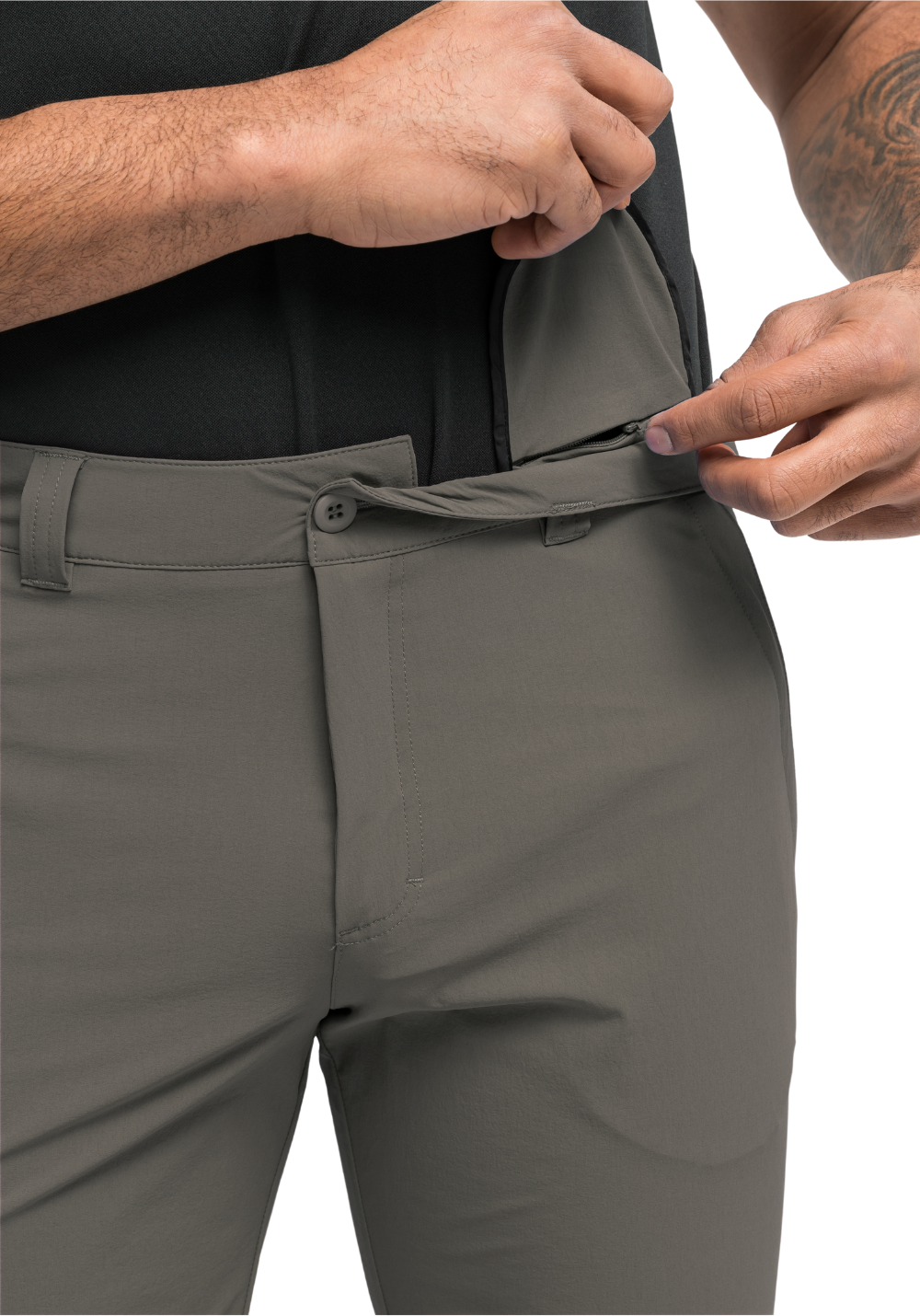 Du brichst mit deinen Freunden zur Sommerwanderung ins Mittelgebirge auf – und der Wetterbericht könnte kaum besser aussehen. Für solche Tage haben wir mit unserer "HUANG" die Funktionalität unserer klassischen Hiking-Hosen ins kleine Format gebracht. Dabei kommt das elastische 4-Wege-Stretch zum Einsatz, mit dem wir die Wanderbermuda besonders bewegungsfreundlich machen. Neben der besonderen Passform sorgt ein Bund mit Schlaufen und integriertem Gürtel für perfekten Sitz. Überrascht dich doch mal ein Sommerregen, trocknet die atmungsaktive HUANG dank dryprotec Technologie blitzschnell. Für wasserabweisende Eigenschaften sorgt die umweltfreundliche, PFC-freie Imprägnierung. Vervollständigt wird die Wanderbermuda durch vier geräumige Taschen. Damit hast du auch mit einer kurzen Hose auf deiner Tour alle wichtigen Kleinigkeiten dabei – und verstaust wertvolle Dinge in der zusätzlichen Sicherheitstasche, die im Inneren der Hose versteckt ist.