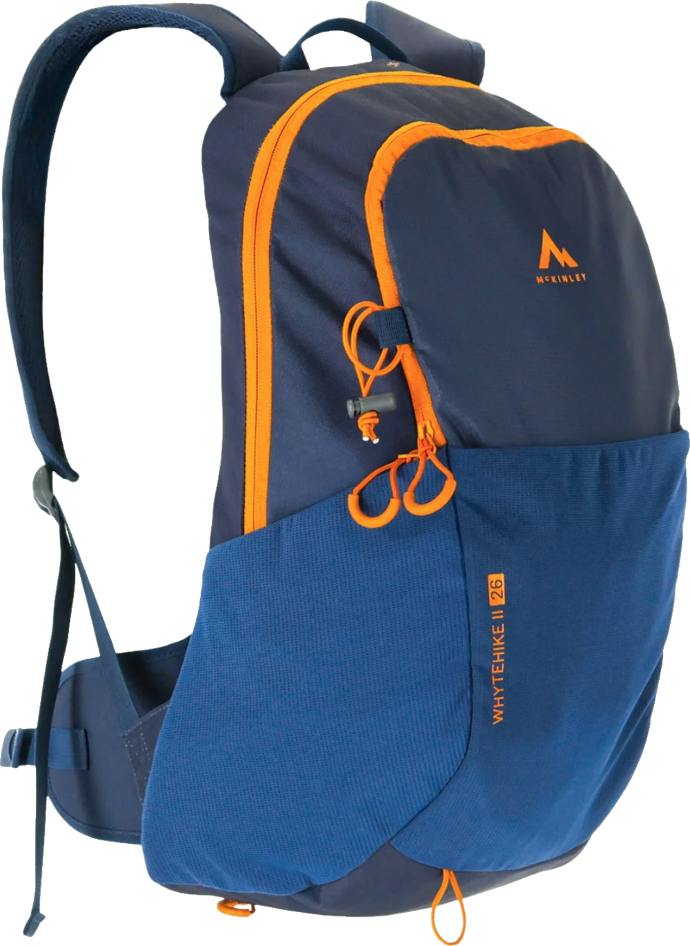 McKINLEY "Whytehike 26L II" ist ein kompakter Wanderrucksack für Touren, bei denen geringes Gewicht und sauberes Handling zählen. Mit nur 620 g bleibt er angenehm leicht, während das 26 l Volumen genug Platz für Tagesausrüstung bietet. Die Rundbogen-Reißverschlussöffnung macht das Packen unkompliziert, weil du schnell an den Inhalt kommst und das Hauptfach übersichtlich beladen kannst. Für den Tragekomfort ist das VENT Tragesystem mit Netzrücken ausgelegt, das den Rückenbereich mit Netzstruktur aufbaut und sich auf bewegte Tage am Berg oder im Wald gut einfügt. Neben dem Hauptfach ergänzt ein praktisches Organizerfach die Innenorganisation, damit Kleinteile nicht lose im Rucksack verschwinden. Für typische Wanderdetails sind eine Wanderstockhalterung und Trinkflaschenhalterungen vorhanden, sodass Stöcke und Flasche schnell griffbereit bleiben. Bei Wetterwechsel liefert die integrierte Regenhülle zusätzlichen Schutz für die Ausrüstung, ohne dass du extra Zubehör einpacken musst.